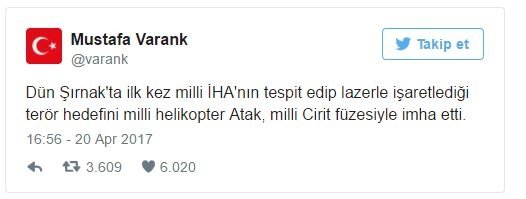 Cumhurbaşkanı Başdanışmanı Mustafa Varank ise sosyal medyadan yaptığı paylaşımda, "Dün Şırnak'ta ilk kez Milli İHA'nın tespit edip, lazerle işaretlediği terör hedefini, milli helikopter ATAK, milli Cirit füzesi ile imha etti" dedi.