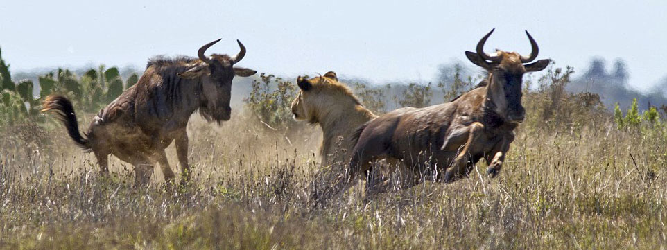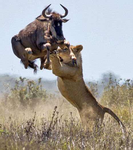 Ancak savunmasız olduklarını düşündükleri avı, üç aslanla karşılaştığında bir anda neredeyse iki metre yükseğe sıçrayap kendisini bekleyen avcıların pençelerinin arasından ve üzerinden geçmeyi başarıyor.