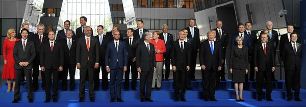 AB Konseyi binasındaki görüşmenin ardından Cumhurbaşkanı Erdoğan, yeni NATO karargâh binasında devlet ve hükümet başkanları onuruna düzenlenen resepsiyona katıldı. Daha sonra liderlerin huzurunda yeni binadaki Washington Anlaşması'nın 5. maddesi, 11 Eylül ve Berlin Duvarı anıtlarının açılışı yapıldı. ABD Başkanı Donald Trump'ın ilk kez katıldığı zirvede liderler aile fotoğrafı çektirdi. Liderler daha sonra NATO'nun yeni karargâh binasının Brüksel'den NATO'ya devir teslim törenine katıldı. ABD Başkanı Trump, törendeki konuşmasının başında İngiltere'nin Manchester kentinde meydana gelen terör saldırısında hayatını kaybedenler için tüm liderleri saygı duruşuna davet etti. Saygı duruşunun ardından Trump konuşmasını yaptı.