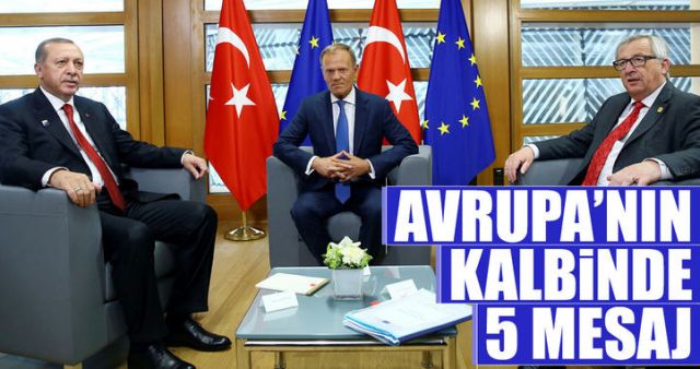 Cumhurbaşkanı Tayyip Erdoğan Avrupa Birliği'nin ve NATO'nun kalbi olan Brüksel'de yapılan NATO zirvesinde 5 önemli mesaj verdi. Erdoğan, AB Konseyi Başkanı Tusk ve AB Komisyonu Başkanı Juncker'e Türkiye-AB ilişkilerinin yeniden ele alınacağı bir zirve toplanması, fasıllarla ilgili yeni yol haritası açılması, vize muafiyeti ile ilgili yükümlülüklerin yerine getirilmesi çağrısında bulundu. NATO Devlet Başkanları Zirvesi'nde ise Cumhurbaşkanı Erdoğan'ın ana mesajı terörle mücadele üzerine oldu. Erdoğan, NATO'nun terör tehdidine karşı daha etkin rol üstlenmesi gerektiğini söyledi. DEAŞ gibi bir terör örgütünün bir başka terör örgütüyle etkisiz hale getirilemeyeceğini ifade eden Erdoğan, 30 dakika kadar görüştüğü Almanya Başbakanı Merkel ve diğer NATO temsilcilerine, FETÖ'cüleri barındırmamaları talebini iletti.