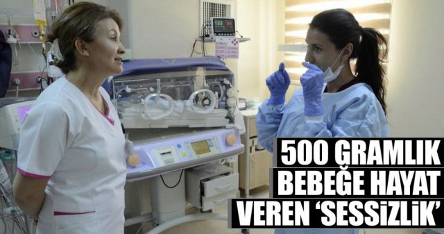 özel şartlarda bakılmaya başlandı. Çok düşük kilolu prematüre bebeklerin yüksek sesten olumsuz etkilenmesi ve yüksek sesin etkisiyle beyin kanaması geçirme riski nedeniyle, minik bebek sessiz bir bölüme alındı. Sessizlikle hayata tutunmaya çalışan bebek için tüm servis seferber olurken, hemşireler bakım ve tedavi sırasında çok düşük ses tonuyla konuşuyor. Bazı hemşireler ise dudak hareketleriyle anlaşıyor. Minik bebeğin anne ve babası da servisin kapısında nöbet tutuyor. Yenidoğan Servisi Sorumlu Hemşiresi Besime Günel, "Bin gramın altındaki bebekleri yüksek ve tiz ses olumsuz etkiliyor. Bu nedenle konuşurken çok dikkat ediyoruz. Ayrıca dışarıdan gelebilecek enfeksiyon ve sesten etkilenmemeleri için çaba gösteriyoruz. Bebek ortalama bin 300 grama gelene kadar bu odada kalması gerekiyor" dedi.