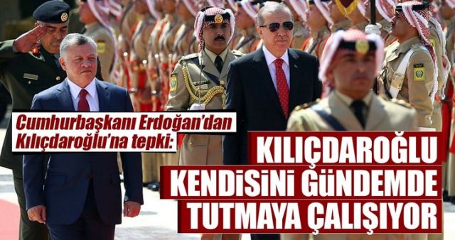 Cumhurbaşkanı Recep Tayyip Erdoğan, dün Ürdün ziyareti öncesi Atatürk Havalimanı'nda basın toplantısı düzenledi. Cumhurbaşkanı Erdoğan, CHP Genel Başkanı Kemal Kılıçdaroğlu'nun Hürriyet Daily News'e verdiği röportajdaki "Tutuklanırsam CHP'nin muhalefet gücü artar" şeklindeki sözleriyle ilgili soruya "Ben bunları değerlendirmeye haiz bir ifade olarak görmüyorum. Yani Kılıçdaroğlu doğmamış çocuğa don biçiyor. Siz böyle bir şey duydunuz mu yargıdan falan filan böyle bir şey geldi mi size. Kendini gündemde tutabilmek için buna benzer şeyler üretiyor. Benim gündemimde böyle bir şey yok" şeklinde cevap verdi.