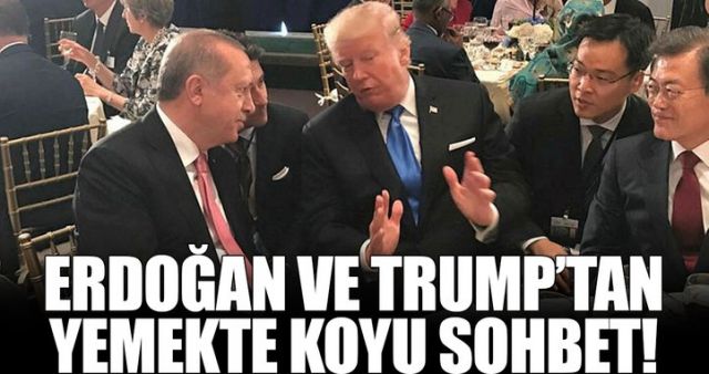 Cumhurbaşkanı Recep Tayyip Erdoğan, Birleşmiş Milletler (BM) 72. Genel Kurulunda heyet başkanları onuruna verilen yemekte ABD Başkanı Donald Trump ile bir süre sohbet etti. BM Genel Sekreteri Antonio Guterres, BM 72. Genel Kuruluna katılan ülkelerin heyet başkanları onuruna yemek verdi. Cumhurbaşkanı Erdoğan, yemekte, ABD Başkanı Trump, Japonya Başbakanı Şinzo Abe ve BM Genel Sekreteri Guterres ile aynı masada oturdu.