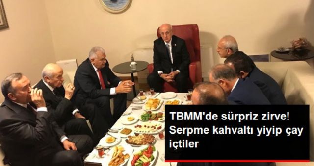 TBMM Başkanı Kahraman ile liderler, burada bir süre sohbet edip kahvaltılık yediler ve çay içtiler.